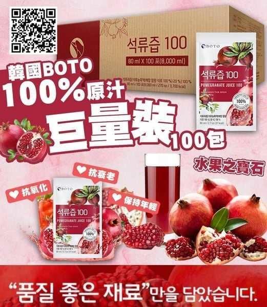 韓國BOTO~100%紅石榴汁(原箱100包x80ml)<---訂貨預計1星期到貨